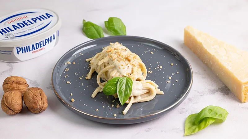 La magia nasce dal contrasto tra le noci tostate, che rilasciano note calde e terrose, e il basilico fresco che esplode con la sua vivace punta di liquirizia. La cremosità del Philadelphia e del Parmigiano avvolge ogni singolo elemento, mentre un filo d'olio extravergine lega il tutto con un finale leggermente pepato e setoso.