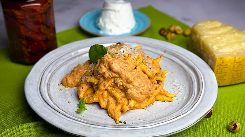 Le trofie incontrano una salsa che è un manifesto di sapori mediterranei: cremosità avvolgente, note dolci e salate in perfetto equilibrio, e una piacevole punta di croccante. Questo piatto promette un'esperienza tattile e gustativa raffinata, dove la semplicità degli ingredienti si trasforma in eleganza sul piatto.