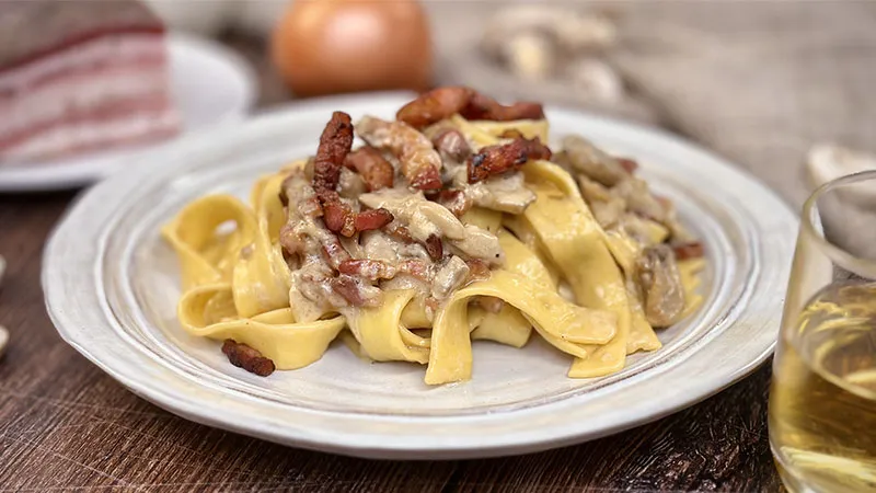 Le pappardelle con pancetta, funghi e panna rappresentano un abbraccio culinario che unisce la generosità della terra alla sapienza della tradizione. Questo piatto promette un'esperienza sensoriale completa, dove la ricchezza avvolgente incontra note terrose e un delicato tocco di affumicatura, creando un equilibrio perfetto tra comfort e raffinatezza.