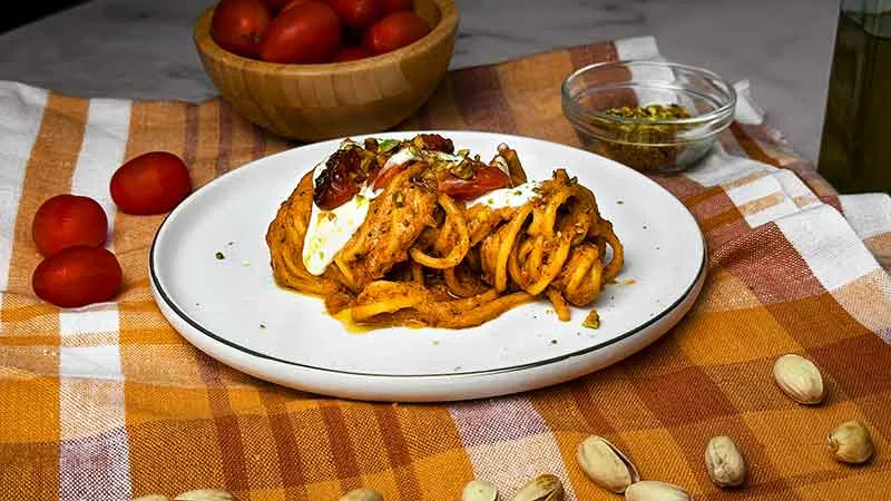 La magia nasce dal contrasto tra la dolcezza concentrata dei pomodorini confit, che rilasciano una nota quasi caramellata, e la freschezza lattiginosa della stracciatella che si scioglie al calore. I pistacchi tostati, speziati con paprica e origano, offrono non solo croccantezza ma un'esplosione di sapidità che lega ogni boccone, mentre i pici, con la loro superficie ruvida, catturano la crema in un equilibrio perfetto di consistenze.