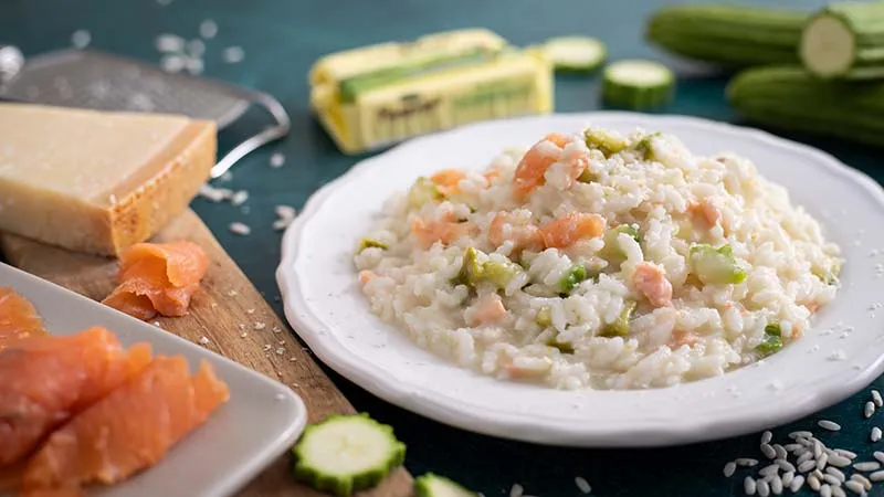 Un'armonia di sapori che danza tra la delicatezza e l'intensità: il risotto con zucchine e salmone affumicato è un'esperienza culinaria che seduce il palato con la sua eleganza rustica. Promette una cremosità avvolgente, dove ogni chicco di riso diventa il custode di un equilibrio perfetto tra terra e mare.