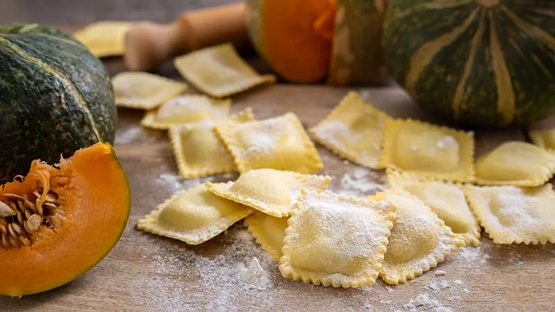 Un abbraccio autunnale che racchiude in una sfoglia sottile come seta il cuore dolce della tradizione mantovana. Questi ravioli di zucca sono più di una semplice pasta ripiena: sono un equilibrio sapiente tra la delicatezza della pasta fatta in casa e l'anima speziata e morbida del ripieno, una promessa di comfort food che parla di feste e di radici. La zucca, trasformata in una crema vellutata, dialoga in un perfetto contrappunto con la sapidità grintosa del Parmigiano Reggiano e il tocco inaspettato, quasi segreto, degli amaretti sbriciolati, che regalano una nota tostata e una piacevole vibrazione aromatica.