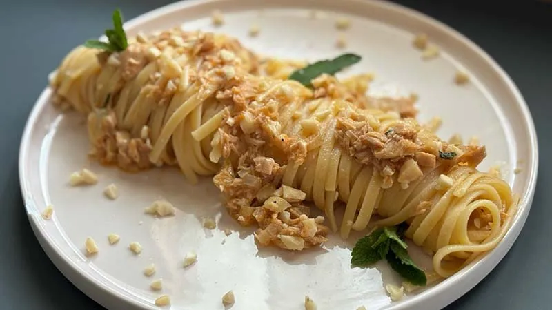 Le Linguine con tonno, mandorle e menta sono un manifesto di sapidità mediterranea, dove la generosità del mare incontra la rustica eleganza della terra. Questo piatto promette un'esperienza tattile e gustativa che gioca magistralmente tra la morbidezza della pasta, la consistenza carnosa del tonno e il croccante finale delle mandorle tostate, tutto avvolto dal fresco abbraccio aromatico della menta. È una ricetta che parla di mare e di sole, capace di trasformare ingredienti semplici in un racconto culinario completo.