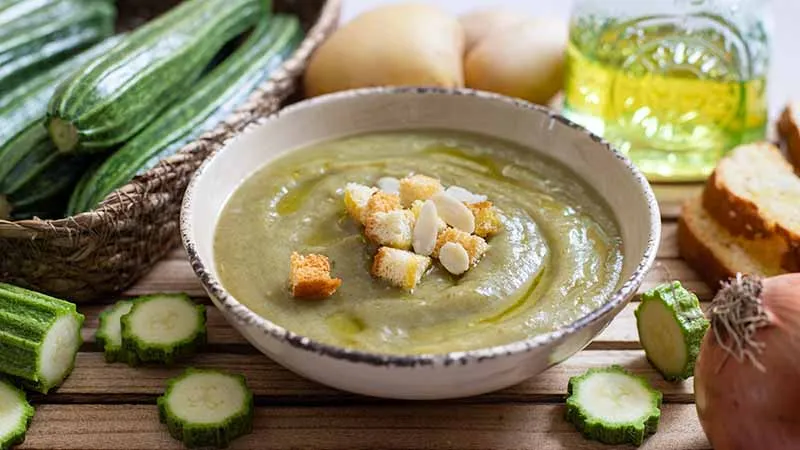 Il segreto risiede nell'alchimia tra la dolcezza terrestrice delle patate, che dona corpo e rotondità, e il tocco erbaceo e leggermente fresco delle zucchine, che alleggerisce l'insieme. In sottofondo, la cipolla stufata lentamente nell'olio extravergine non si limita a un soffritto, ma diventa il fondale caramellato e profumato che lega ogni boccone, regalando profondità senza mai sopraffare. Perfetta per una cena intima dopo una giornata fredda, si offre come un piatto unico di sorprendente completezza. La sua texture vellutata, ottenuta senza forzature, conclude ogni cucchiaiata con una sensazione di calore e benessere che va oltre il semplice nutrimento.