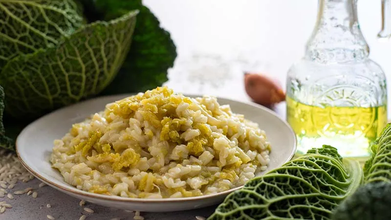 La magia avviene nella lenta metamorfosi della verza, che da croccante diventa quasi setosa, fondendosi con i chicchi carnaroli in un dialogo di consistenze. Lo scalogno stufato dona una dolcezza di fondo, mentre un tocco d'aglio, discreto ma presente, regala un'ombra aromatica che sostiene senza invadere. L'olio extravergine, a crudo finale, è il colpo di luce che unisce e illumina ogni boccone.