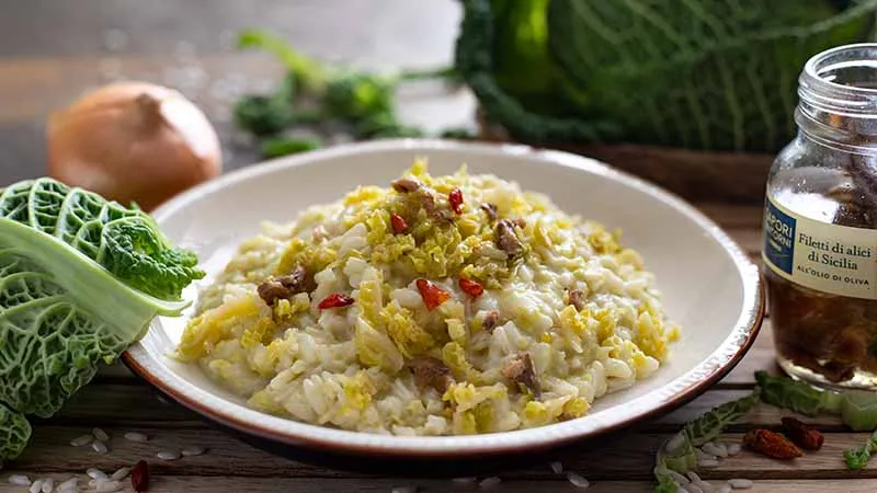 Un abbraccio invernale che nasce dall'incontro tra la dolcezza terragna e il carattere del mare. Questo risotto promette una cremosità avvolgente, dove ogni chicco diventa veicolo di sapori profondi e rassicuranti, trasformando ingredienti umili in un'esperienza di comfort food raffinato. La verza, cuocendo lentamente, si trasforma in una morbida carezza vegetale, mentre le alici non si limitano a un tocco di salsedine: si sciolgono in un fondo sapido che struttura l'intero piatto con la loro presenza discreta ma determinante.