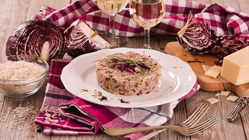 Il carattere della ricetta nasce dall'incontro tra Radicchio Lungo, Riso, Vino Bianco, Dado Vegetale: consistenze diverse, profumi netti e sapori che restano equilibrati al palato.