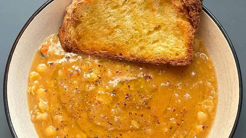 La magia nasce dall'incontro tra la dolcezza terrosa dei ceci, esaltata da una lunga cottura, e l'irruenza pungente del rosmarino fresco, che infonde note resinose e mediterranee. Il soffritto iniziale, con il suo fondo dorato, e la passata di pomodoro aggiungono un'ombra di acidità e umami, bilanciando la corposità del piatto. Ogni cucchiaiata rivela una texture vellutata, interrotta piacevolmente dalla croccantezza finale di un pane tostato e dallo scarto lieve del peperoncino.