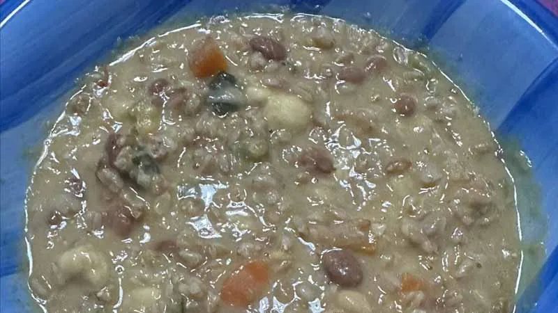 La magia sta nei contrasti: la tenerezza burrosa dei fagioli borlotti dialoga con la lieve resistenza del farro, mentre le carote e le zucchine, ridotte a piccoli dadini, rilasciano dolcezze terrose che si intrecciano con il tocco sapido della crosta di parmigiano. L'aglio e la cipolla, appassiti nell'olio extravergine, creano un fondale aromatico che lega ogni elemento senza sopraffarlo, in un equilibrio perfetto tra sostanza e delicatezza.