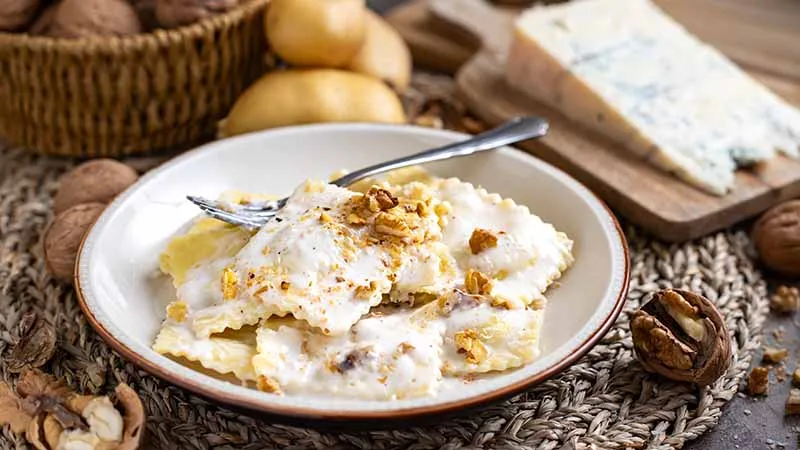 La magia sta nei contrasti sapientemente orchestrati: la cremosità calda delle patate si fonde con la piccantezza erborinata del Gorgonzola, mentre le noci, tostate leggermente, offrono una piacevole nota croccante e terrosa che interrompe la morbidezza. La salsa di panna, appena sfiorata dallo stesso formaggio, avvolge ogni raviolo senza sopraffarlo, bilanciando ricchezza e profondità.