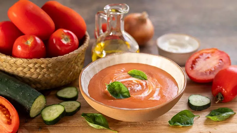 Il segreto risiede nel dialogo perfetto tra la dolcezza concentrata e lievemente acidula dei pomodori San Marzano, cotti fino a sprigionare la loro anima, e la freschezza acquosa e vegetale del cetriolo, che infonde una piacevole leggerezza. L'olio extravergine lega il tutto con un filo d'oro, mentre il basilico, aggiunto a crudo, esplode in un finale aromatico che completa il quadro.