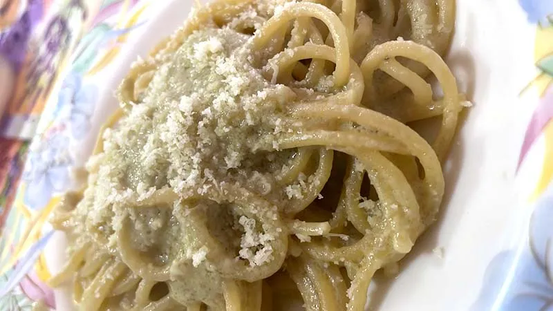 La magia risiede nel contrasto: la punta amarognola e minerale del carciofo, esaltata da un soffritto d'aglio dorato e olio extravergine, viene addolcita e avvolta dalla panna, creando una salsa setosa che si lega perfettamente agli spaghetti. Il finale di Parmigiano grattugiato aggiunge una punta sapida e un retrogusto di nocciola che completa l'armonia.