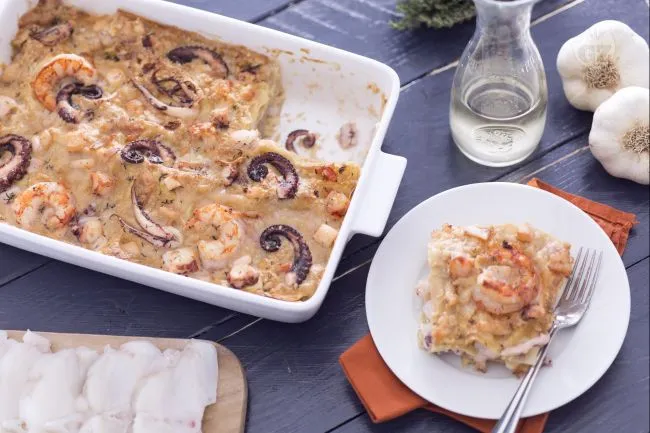 La tenerezza carnosa del polpo, sapientemente cotto, dialoga con la dolcezza succulenta dei gamberi, mentre la coda di rospo e i calamari aggiungono note di delicatezza e struttura. Il tutto è avvolto da una besciamella profumata che, come una seta culinaria, lega gli elementi senza sopraffarli, mentre il Grana Padano grattugiato in superficie crea una crosticina dorata e una punta sapida che esalta ogni strato.