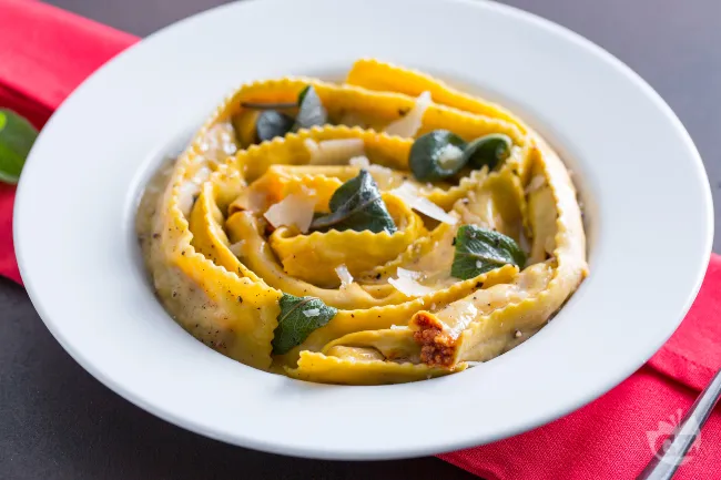 Il segreto risiede nell'equilibrio tra la ricchezza del ripieno e la finezza dell'involucro. Il ragù, concentrato e profondo grazie al vino rosso e al concentrato di pomodoro, viene bilanciato dalla dolcezza naturale di carote e cipolle dorate, mentre la pancetta dolce aggiunge una nota sapida e un tocco di morbidezza. Il finale in padella con il burro alla salvia lega il tutto, avvolgendo ogni nastro di pasta in un aroma erbaceo e burroso che fa da sipario perfetto.
