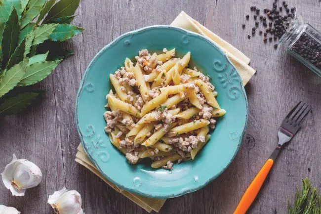 Il vino bianco, sfumato con maestria, non aggiunge acidità ma piuttosto una nota fruttata e volatile che lega il tutto, mentre le penne rigate catturano ogni goccia di quel sugo prezioso, creando un morso perfetto. Ideale per una cena d'autunno o per un pranzo della domenica che vuole sorprendere senza appesantire, questo piatto unisce la praticità della pasta alla profondità di un ragù lavorato con cura, lasciando in bocca una sensazione di pienezza e una leggera, piacevole persistenza erbacea.