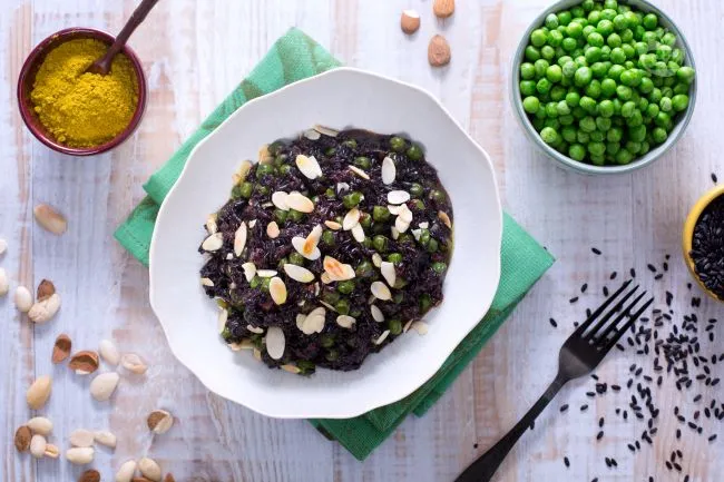 La magia risiede nell'equilibrio: il calore aromatico del curry, mai aggressivo, dialoga con la dolcezza naturale dei piselli, creando un fondo armonioso su cui il riso nero, con la sua consistenza distintiva, si impone. Ogni boccone rivela un gioco di contrasti: la cremosità del formaggio fuso si fonde con il riso, mentre le mandorle tostate irrompono con una croccantezza dorata che esalta la morbidezza del tutto.