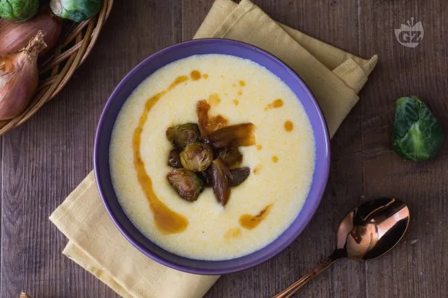 La magia si compone nel contrasto tra la cremosità setosa della polenta, addensata con panna e Parmigiano Reggiano, e la croccantezza dei cavoletti di Bruxelles, che insieme agli scalogni vengono glassati in una lucente caramellatura di miele e zucchero di canna. Ogni cucchiaiata offre un gioco sensoriale: il calore profondo della vellutata, il retrogusto umami del formaggio stagionato e l'esplosione agrodolce delle verdure, legati dal filo d'oro dell'olio extravergine.