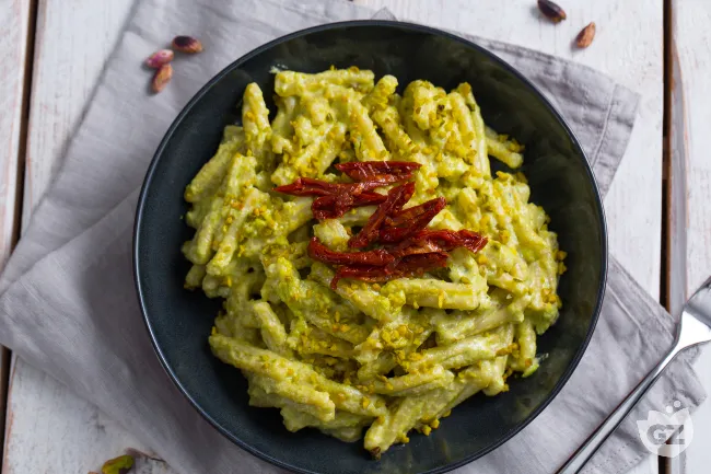 Il segreto risiede nel dialogo perfetto tra ingredienti: i pistacchi, macinati fino a rilasciare i loro oli preziosi, creano una base opulenta che il Parmigiano Reggiano stagionato amplifica con punte di umami, mentre la scorza di limone interviene con un guizzo fresco che taglia la grassezza. I pomodori secchi, come piccoli concentrati di sole, e la granella finale offrono quel contrappunto croccante e salino che risveglia ogni boccone.