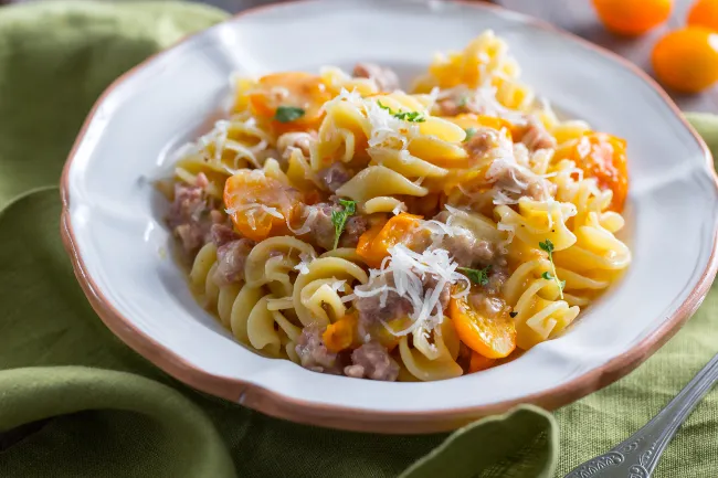 La magia nasce dal contrasto tra la dolcezza caramellata dei datterini gialli, esplosi in padella, e il piccante terroso della salsiccia sfrigolante. Il provolone, sciolto al momento giusto, lega gli elementi con una nota lattea e leggermente piccante, mentre il timo fresco infonde un'aria mediterranea che rievoca i profumi dell'estate.