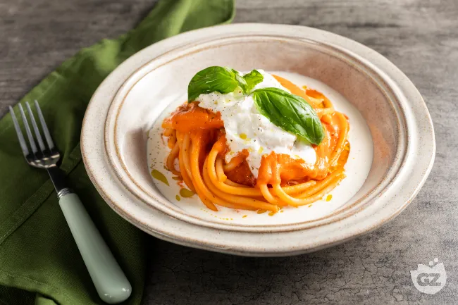 Immaginate un abbraccio cremoso che accoglie la pasta, dove la dolcezza estiva dei pomodorini si fonde con la ricchezza burrosa della stracciatella in un equilibrio perfetto. Questo piatto promette un'esperienza sensoriale raffinata, capace di trasformare ingredienti semplici in un primo di carattere, elegante ma genuino.