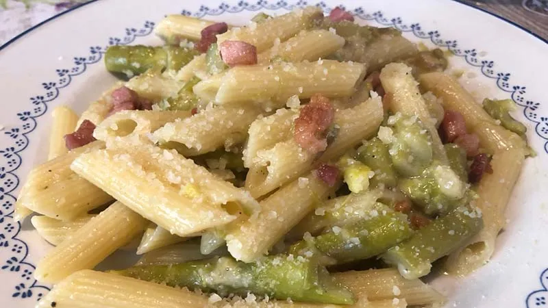 La magia sta nel contrasto sensoriale: la purea vellutata degli asparagi, dal retrogusto leggermente amarognolo, accarezza il palato mentre i cubetti di pancetta sfrigolanti rilasciano una nota affumicata e salina. Il parmigiano, sciogliendosi, lega i sapori con una punta di umami che esalta senza coprire, e un tocco finale di pepe nero risveglia l'insieme con una lieve pungenza.