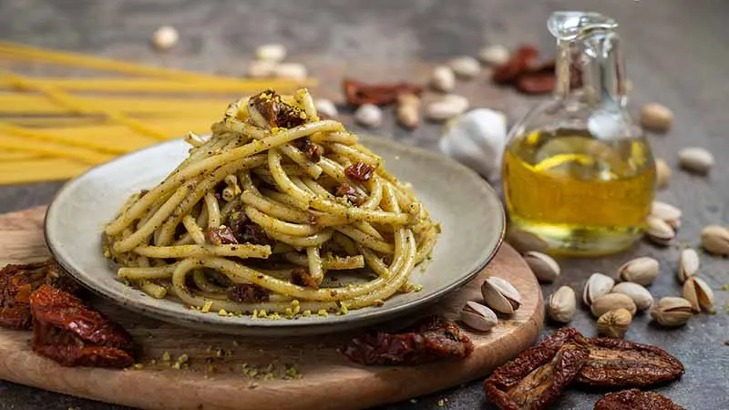 Il pesto di pistacchi e pomodori secchi è il cuore pulsante della ricetta, un'emulsione che gioca su contrasti magistrali. La dolcezza burrosa dei pistacchi dialoga con l'acidità sapida dei pomodori secchi, mentre il basilico fresco e l'aglio lieve donano freschezza e carattere. Il Parmigiano e il Pecorino Romano fondono la loro potenza, regalando una nota umami che lega il tutto in una cremosità setosa.