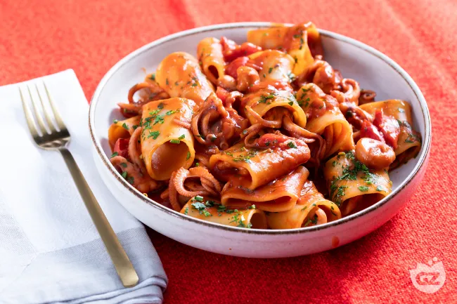 I Paccheri al sugo di calamari rappresentano l'essenza della cucina di mare mediterranea, dove l'audacia dei sapori incontra l'eleganza della semplicità. Questo piatto promette un viaggio sensoriale che inizia con il profumo intenso dello zafferano e del mare, per culminare in un abbraccio di consistenze e gusti profondamente gratificanti.
