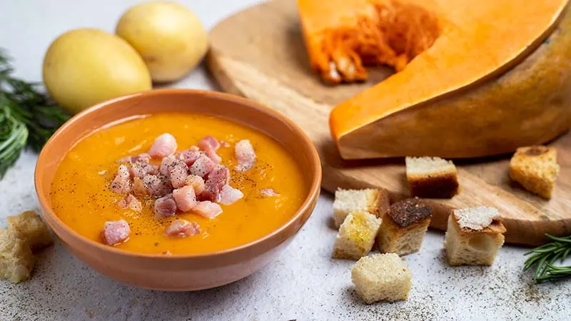 Il segreto risiede nel dialogo perfetto tra i suoi protagonisti: la zucca, cotta fino a sprigionare le sue note caramellate, viene temperata dall'umami del Parmigiano Reggiano grattugiato, mentre il brodo vegetale ne esalta la rotondità. A coronare il tutto, i cubetti di pancetta dolce, rosolati fino a diventare una guarnizione croccante e dorata, offrono un contrasto di texture e un'esplosione di sapore che risveglia ogni cucchiaiata.