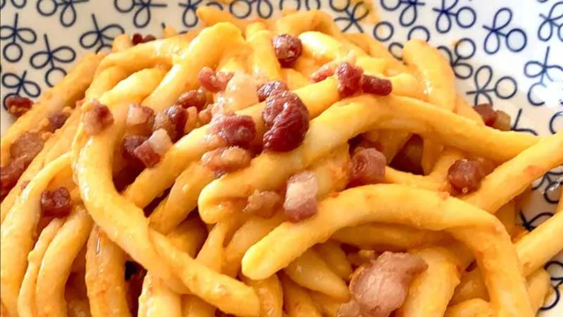 Il segreto risiede nei contrasti magistrali: la cremosità vellutata del pesto, ottenuto da pomodorini ciliegino dolci e concentrati, avvolge i fileja mentre il guanciale, croccante e sapido, offre note salate che si stagliano nette. I pinoli tostati regalano una carezza croccante, mentre il Parmigiano stagionato e l'olio extravergine di qualità intessono un retrogusto rotondo e persistente, bilanciato dal fresco puntuale del basilico.