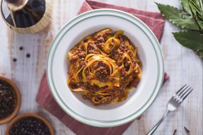 Il vino rosso e la passata di pomodoro fondano il loro carattere in un sugo vellutato, mentre il classico soffritto di carote, cipolle e sedano fornisce quella dolcezza di fondo che arrotonda ogni boccone. Perfetto per una cena d'autunno o per un pranzo festivo che vuole stupire senza clamore, questo primo piatto conclude la sua esperienza con una sensazione di pienezza armoniosa, lasciando in bocca il ricordo persistente delle spezie e la soddisfazione di un piatto compiuto.