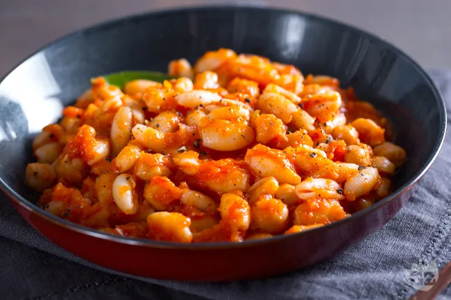 La magia nasce dal dialogo tra la dolcezza caramellata di carote, cipolle e sedano e la robustezza rustica dei legumi, schiacciati parzialmente per creare una doppia consistenza. La passata di pomodoro, addolcita dal fondo di cottura e risvegliata dal rosmarino e dall'alloro, lega il tutto in una salsa vellutata che si attacca perfettamente alla superficie della pasta fresca.