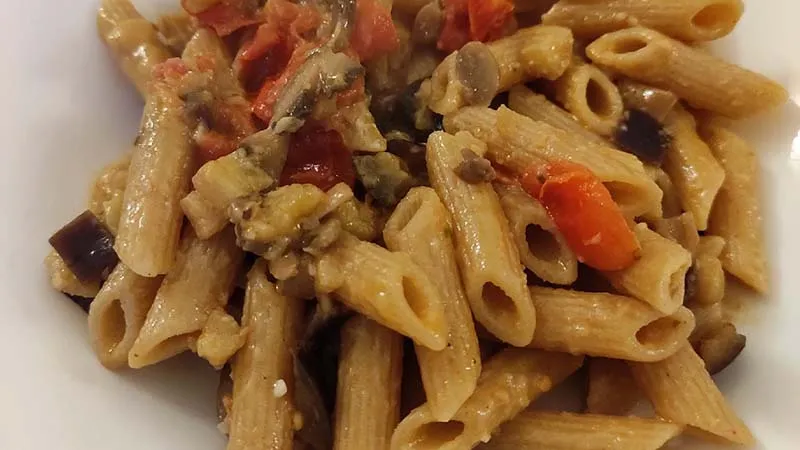 Un primo piatto che celebra l'equilibrio mediterraneo: le pennette integrali diventano il palcoscenico per un incontro tra la rustica profondità dei funghi trifolati e la dolcezza carnosa delle melanzane. La promessa è quella di un piatto strutturato ma leggero, dove ogni boccone racconta una storia di sapori puliti e ben definiti.