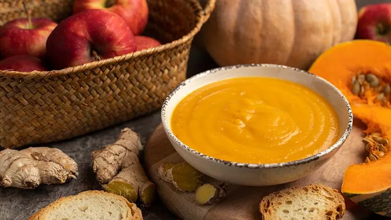 profonda e terrosa e un guizzo vivace che risveglia il palato. Promette e mantiene una cremosità avvolgente, una promessa culinaria di conforto e carattere. La zucca, cuore dell'autunno, si fonde in un dialogo sorprendente con la freschezza acidula della mela, mentre lo zenzero non si limita a un accenno, ma traccia una scia calda e pepata che persiste piacevolmente dopo ogni cucchiaiata.