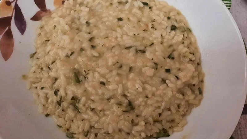 La cipolla, appassita lentamente, dona una dolcezza di fondo che apre la strada al tocco fresco e leggermente erbaceo delle zucchine, tagliate in modo da trattenere una piacevole consistenza. Il riso, coccolato dal brodo vegetale, rilascia la sua crema naturale che si lega perfettamente con un filo d'olio extravergine a crudo, aggiungendo un finale fruttato e avvolgente.
