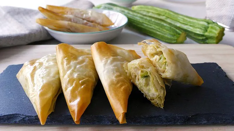 La magia risiede nei contrasti: la sfoglia sottilissima, dorata e friabile sotto i denti, cede il passo a un ripieno morbido e profumato, dove lo scalogno stufato esalta la freschezza terrosa delle zucchine e la succosità dei gamberetti. Ogni strato di pasta fillo, spennellato con olio extravergine, cuoce in una leggera doratura che esalta note di nocciola tostata.
