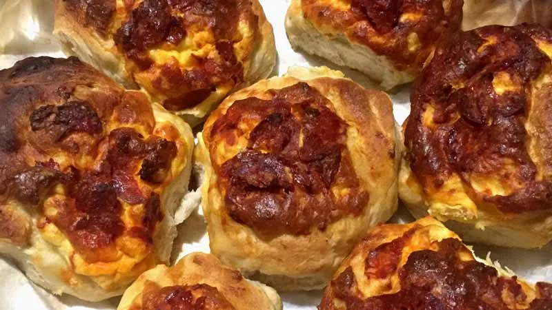 La magia nasce dal contrasto tra la morbidezza umida e delicata della ricotta di pecora e il guizzo sapido e speziato della soppressata, sapientemente legati dalla grattugia corposa del pecorino. L'impasto, lievitato con pazienza, avvolge questo cuore saporito con una crosta dorata e una mollica soffice che cede al morso, rilasciando un'armonia di consistenze cremose, carnose e lievemente granulose.