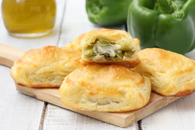 terrosa dei peperoni stufati. Queste sfogliatine promettono un viaggio sensoriale in pochi morsi, trasformando l'umile antipasto in una piccola dichiarazione di stile culinario.