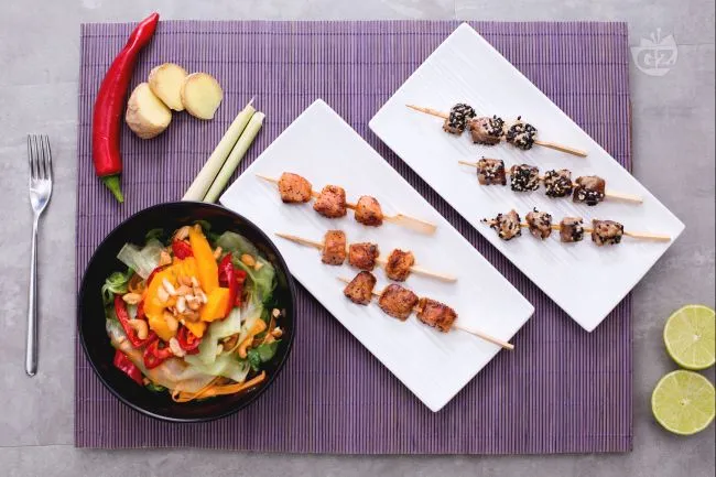 La magia risiede nei contrasti tessuti con maestria: la carne soda del tonno e quella burrosa del salmono catturano diversamente la marinatura speziata, creando un gioco di texture inaspettato. I semi di sesamo tostati aggiungono una nota croccante, mentre il lemongrass e il lime distillano nell'insalata un'aria tropicale, leggera e persistente. Ogni morso è un dialogo tra il calore della griglia e la vibranzia cruda dell'accompagnamento.