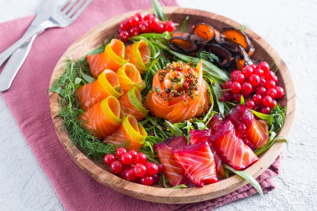 La magia nasce dall'incontro tra la ricchezza burrosa del salmone abbattuto e le marinature che lo scolpiscono: gli agrumi non trattati e il gin donano note brillanti e botaniche, mentre la barbabietola impasta il pesce in un viola vellutato. Il nero di seppia, contrastando con i grani di pepe rosa, crea un gioco visivo e tattile dove la dolcezza dello zucchero tempera l'intensità del sale.