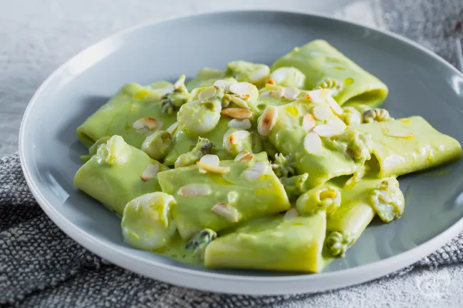 I paccheri con seppioline e piselli è un piatto che incarna l'eleganza rustica della cucina costiera italiana, dove la generosità della pasta incontra la delicatezza del mare in un abbraccio cremoso. Promette un viaggio sensoriale tra la dolcezza tenera dei pisellini e il carattere sapido delle seppioline, bilanciato da una nota agrumata che schiarisce il palato.