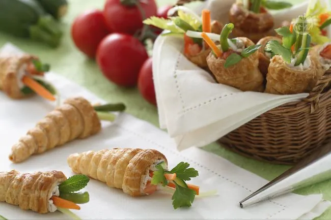 La magia risiede nel contrasto tra la sfoglia vegana che si sbriciola in mille scaglie dorate e le due creme vellutate: una di prosciutto cotto e formaggio fresco, liscia e rinfrescante, si oppone alla crema di mortadella e pistacchi, granulosa e profondamente aromatica. Le verdure fresche – carote croccanti, fagiolini teneri, zucchine delicate – e l'aromatica nota di menta offrono un finale leggero e vegetale, bilanciando la ricchezza delle farce.