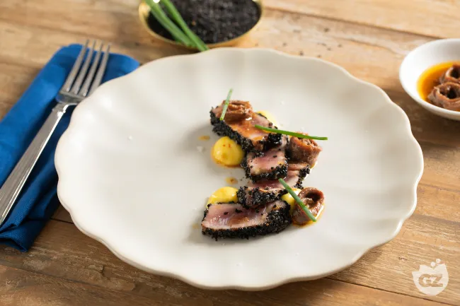 Un dialogo audace tra il mare e la terra, dove la nobiltà del tonno incontra il carattere deciso del sesamo nero. Questo tataki non è una semplice cottura, ma una promessa di contrasti: la crosta croccante che cede al cuore succoso, il calore fugace della padella che preserva la freschezza oceanica del pesce. Una proposta che seduce con la sua eleganza istintiva e la precisione tecnica.