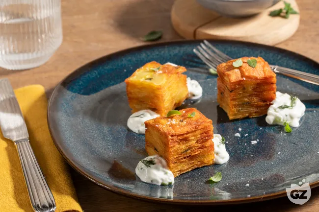 si nasconde un gioco di contrasti magistrale: la crosta dorata e croccante che cede sotto i denti rivela un cuore cremoso e stratificato, mentre la freschezza acida dello tzatziki taglia con grazia la ricchezza delle patate. Ă una promessa di comfort food raffinato, dove la tecnica incontra la generositĂ della terra.