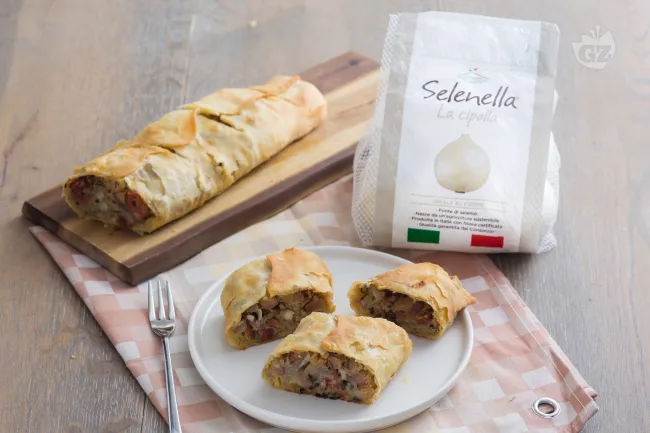 Il segreto risiede nell'armonia dei contrasti: le cipolle bianche, caramellate fino a una doratura ambrata, rilasciano una dolcezza profonda che avvolge le mele Red Delicious, la cui polpa rimane leggermente croccante e acidula. Contro questo fondale agrodolce, lo speck si offre in scaglie croccanti, regalando un tocco salino e affumicato che viene esaltato dal timo fresco, con le sue note terrose e leggermente pungenti. Perfetto come antipasto elegante o finger food per un aperitivo raffinato, questo strudel unisce la praticità del servizio a fette all'effetto scenografico di una crosta dorata e sfogliata, capace di sorprendere gli ospiti con un accostamento inaspettato ma immediatamente convincente.