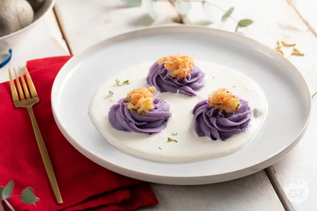 La patata viola, lessata e trasformata in un purè vellutato con burro e latte, regala non solo un colore intenso e regale, ma una dolcezza terrosa che esalta la succosità dei gamberi, marinati nel lime e nell'olio extravergine. Il contrasto è magistrale: la noce moscata e il timo aggiungono calore ed erbaceità, mentre il pepe nero macinato al momento risveglia ogni boccone con una punta di vigore.