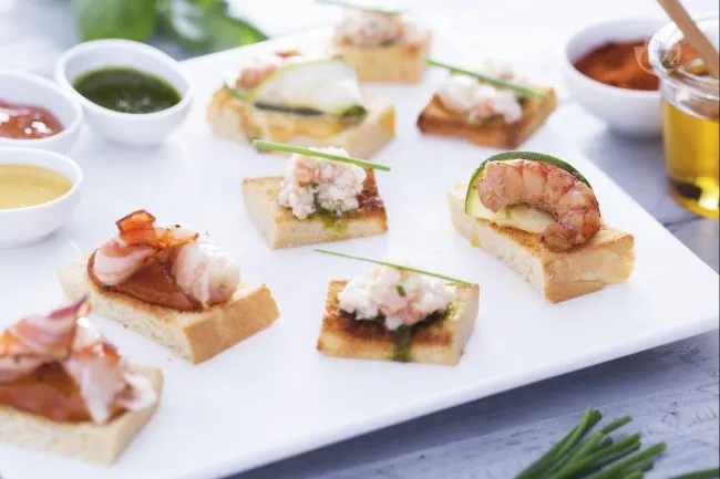 Un viaggio sensoriale in tre atti, dove la dolcezza soffice del pan brioche tostato diventa il palcoscenico per un'esplorazione audace del mare. Questo tris di canapè promette un dialogo raffinato tra consistenze e sapori, elevando il finger food a piccola opera di gastronomia, perfetta per sorprendere e deliziare. La promessa è chiara: tre esperienze distinte ma armoniose, dove il gambero, protagonista indiscusso, si trasforma ad ogni boccone.