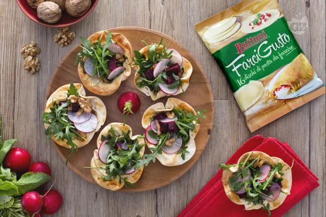 Un gioco di contrasti che seduce il palato: la croccantezza dorata della pasta sfoglia incontra la freschezza erbacea della rucola, in un equilibrio perfetto tra rustico e raffinato. Queste coppette promettono un'esperienza sensoriale completa, dove la dolcezza terrosa delle barbabietole dialoga con il morso pepato dei ravanelli, avvolti dall'untuosità nobile dell'olio extravergine.