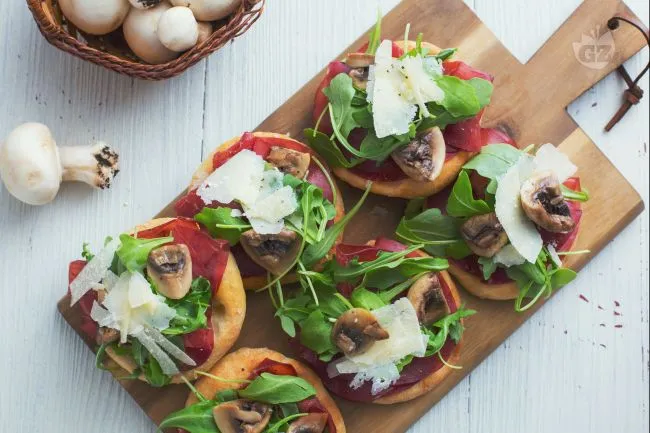 Il segreto risiede nel dialogo tra gli elementi: la rucola, con la sua nota pepata e fresca, taglia la ricchezza dei funghi trifolati, intensi e terrosi, mentre le scaglie di Grana Padano, sciogliendosi leggermente, aggiungono un tocco di umami e una piacevole granulosità. Ogni morso è un contrasto calcolato tra il caldo della base e il fresco degli ingredienti, tra la consistenza croccante e quella vellutata. Perfette per un aperitivo che vuole lasciare il segno, queste schiacciatine uniscono la praticità del finger food a una complessità di gusto che sorprende. Si trasformano in un piatto conviviale, ideale per aprire una serata con stile, senza rinunciare all'immediatezza e al piacere di condividere.