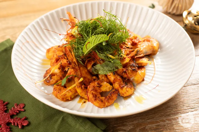 La magia risiede nei contrasti sapientemente bilanciati: la croccantezza salina del sale di Maldon esalta la succosità dei crostacei, mentre lo zafferano in pistilli e la paprika dolce costruono un fondo caldo e dorato. Il finocchietto selvatico e la menta regalano una nota anisata e vibrante, che il succo di limone fissa con una punta di acidità brillante.