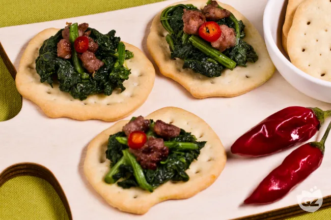 Un inno alla rusticità pugliese che si trasforma in stuzzichino elegante: le schiacciate con cime di rapa piccanti sono un'esplosione di carattere, dove la croccantezza dorata incontra il cuore tenero e leggermente amarognolo delle verdure di stagione. Promettono e mantengono un viaggio sensoriale tra texture contrastanti e un calore speziato che riscalda il palato senza sopraffarlo. La magia risiede nel dialogo perfetto tra la salsiccia sbriciolata, che rilascia note grasse e sapide, e le cime di rapa saltate con peperoncino fresco e aglio, che portano una vibrante nota vegetale e piccante.